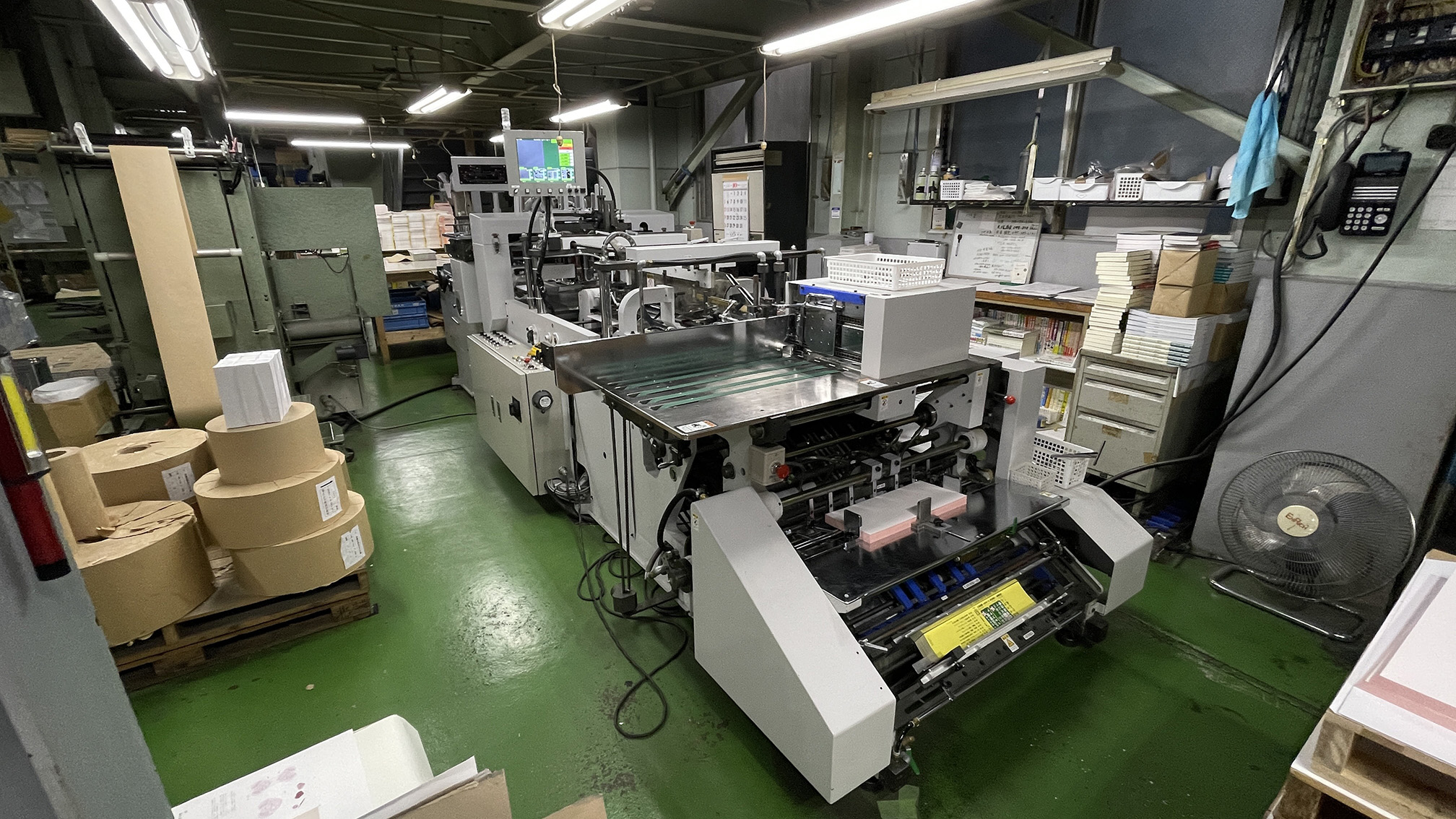 並製無線綴機 22 駒、万力丁合機 24駒、CCD 絵柄検知機全駒、乱丁防止装置、天地検知、ウエイトチェッカー、三方断裁機、自動交互積機、トライオート、自動帯掛機、ベルト研磨機、穴開機8口、貼込機、紙折機5台(32P対応)、 オートスタッカー、紙粉プレス機