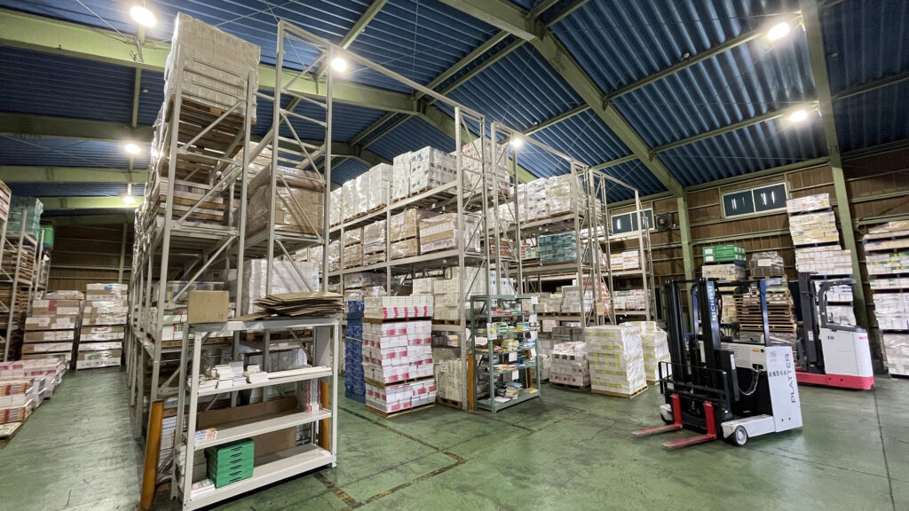 出版物をタイトルごとに仕分けし、パレットと棚による管理。